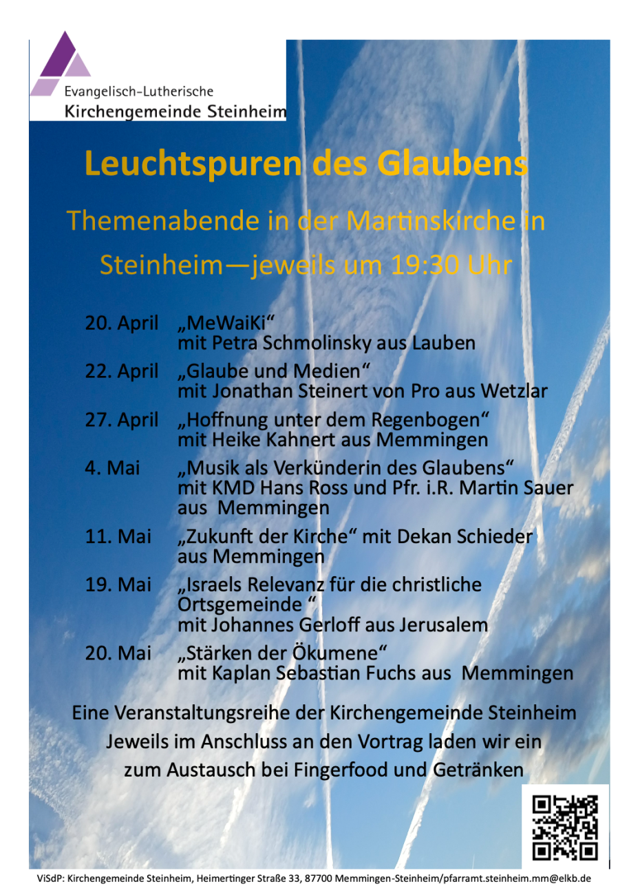 Alle Termine der Vortragsreihe "Leuchtspuren" finden Sie als eine PDF-Datei unterhalb der Bildreihe. Die einzelnen Termine im Mai finden Sie später auch an dieser Stelle als einzelne Vorschaubilder.